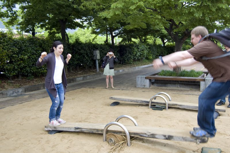 They had a park nearby with teeter toters in front. We thought it would be fun if we could launch people on them. We did it with Benjamin and he went really high. Then everyone got an idea, if Benjamin could go high, then I could go even higher. If you're like us or not so smart, then you're thinking this will turn out good. If you think it's a bad idea, you were right. Here's what happened: You have me on one side and Stephen, who's double my weight on the other side. Photos are courtesy of Rachael and video is courtesty of Victoria.